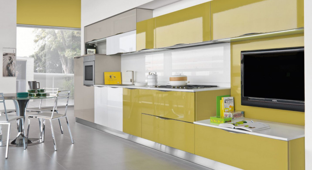 Accostate a moduli in altri materiali, le ante in vetro laccato valorizzano la cucina, dando vita a giochi di luce sulla superficie.