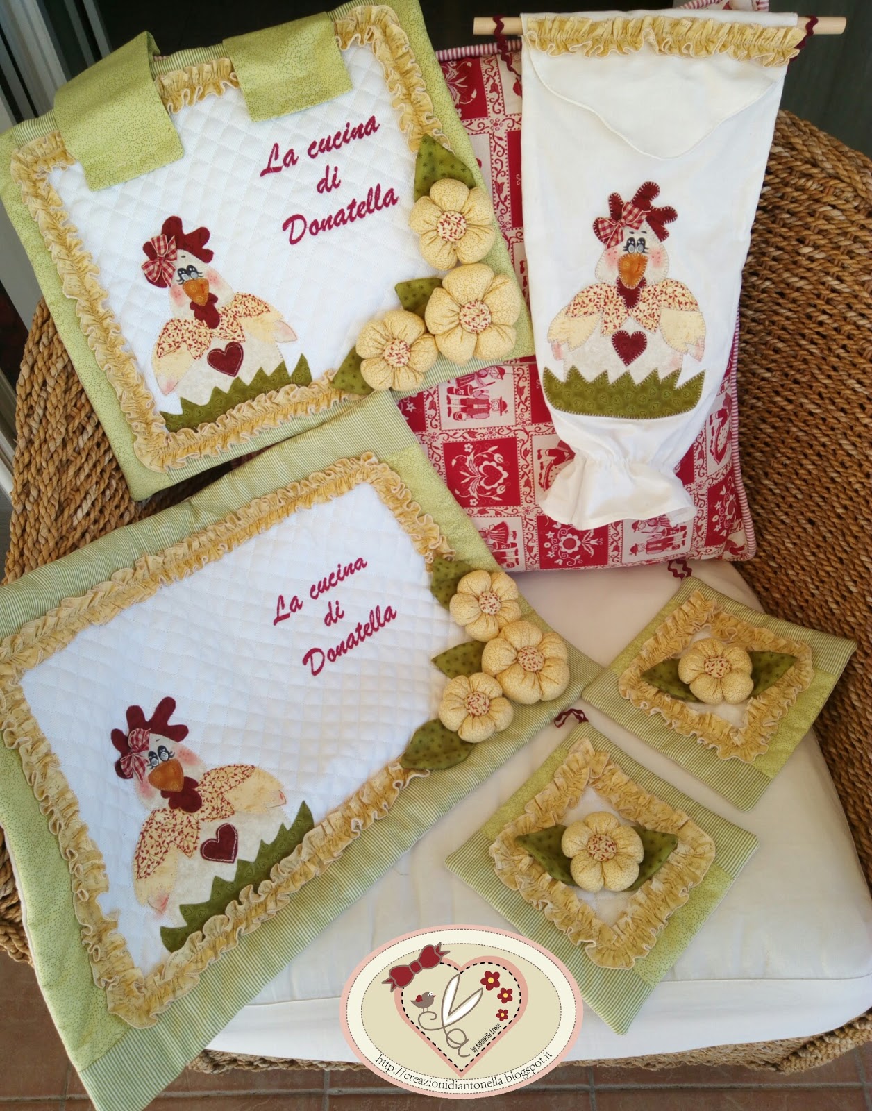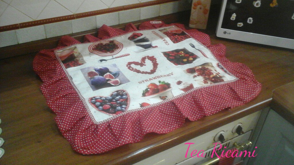 Copri fornelli 50 x 70 in cotone, con pizzo san gallo, imbottito e decorato con fiori in tessuto.